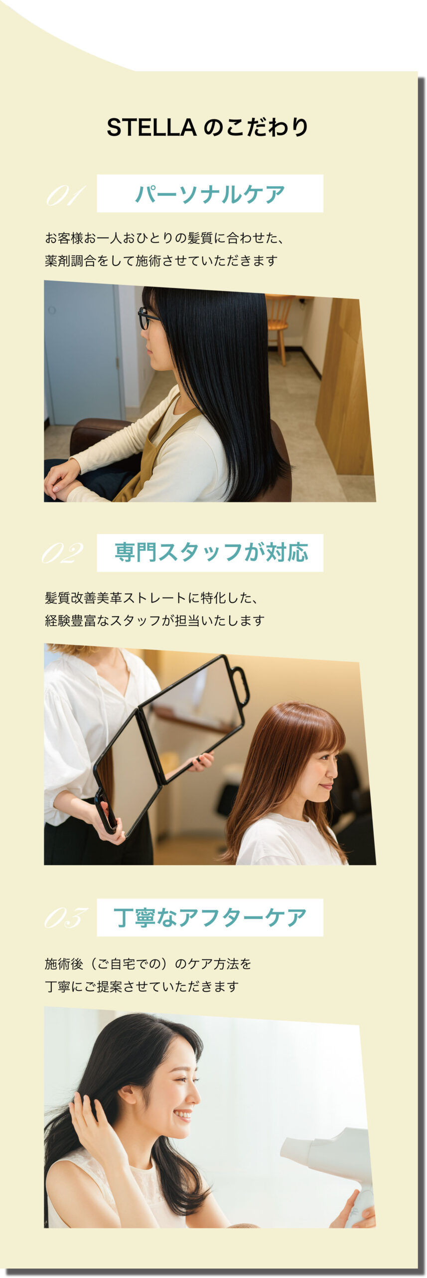 カウンセリング・薬剤塗布・アイロン工程・仕上げまで丁寧に行います。